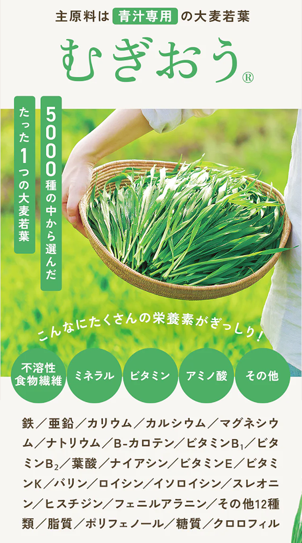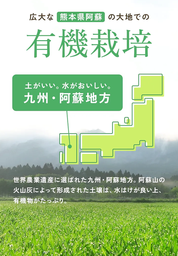 主原料の「むぎおう®」は、5,000種の中から選ばれた、青汁専用の大麦若葉。 土と水に恵まれた地、熊本県阿蘇で有機栽培されています(有機JAS認証取得)。