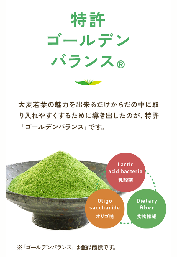 これら、大麦若葉の長所を活かす栄養バランスは、「ゴールデンバランス®」として特許を取得。