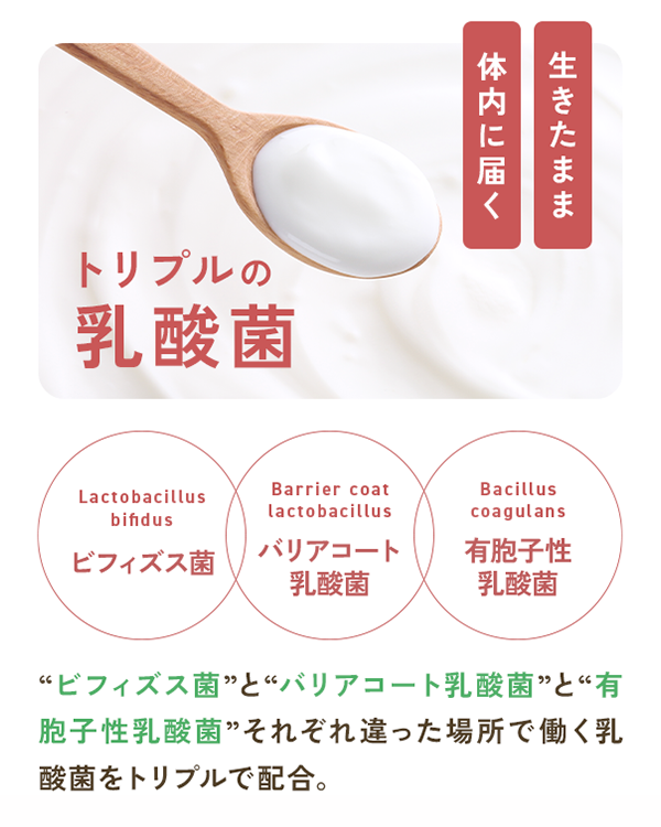 例えば、体の内側から環境づくりをサポートする善玉菌は3種を配合。