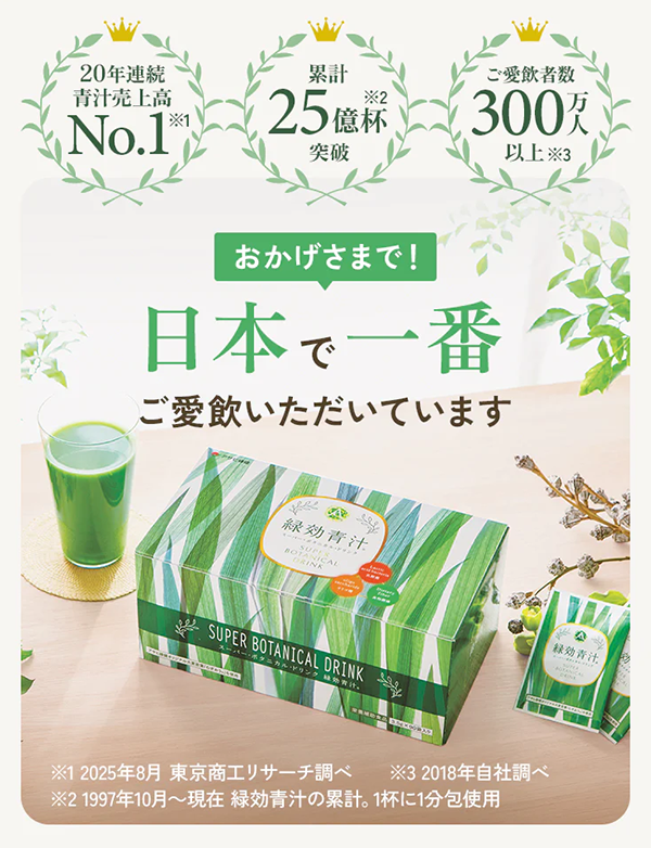※2:20年連続青汁売上高No.1(2025年8月 東京商工リサーチ調べ)