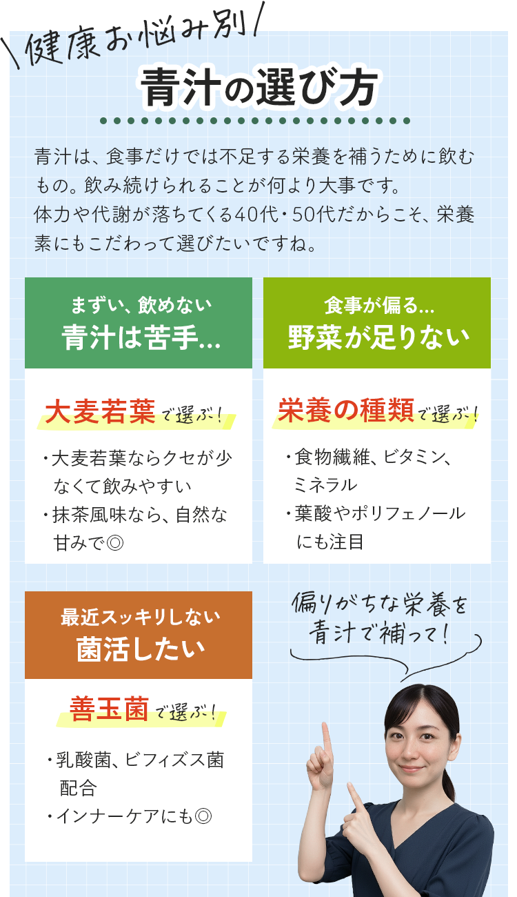 健康の悩みが増える40代・50代にこそ、この青汁はおすすめです。