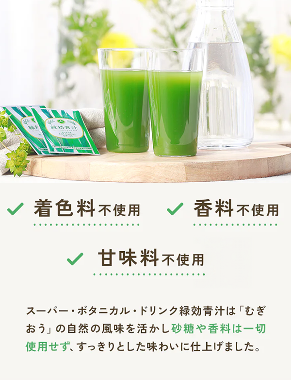 「緑効青汁」は、大麦若葉の長所を活かすため、栄養バランスにこだわっています。