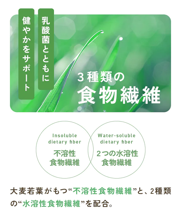 大麦若葉の不溶性食物繊維と、2種類の水溶性食物繊維を配合しています。